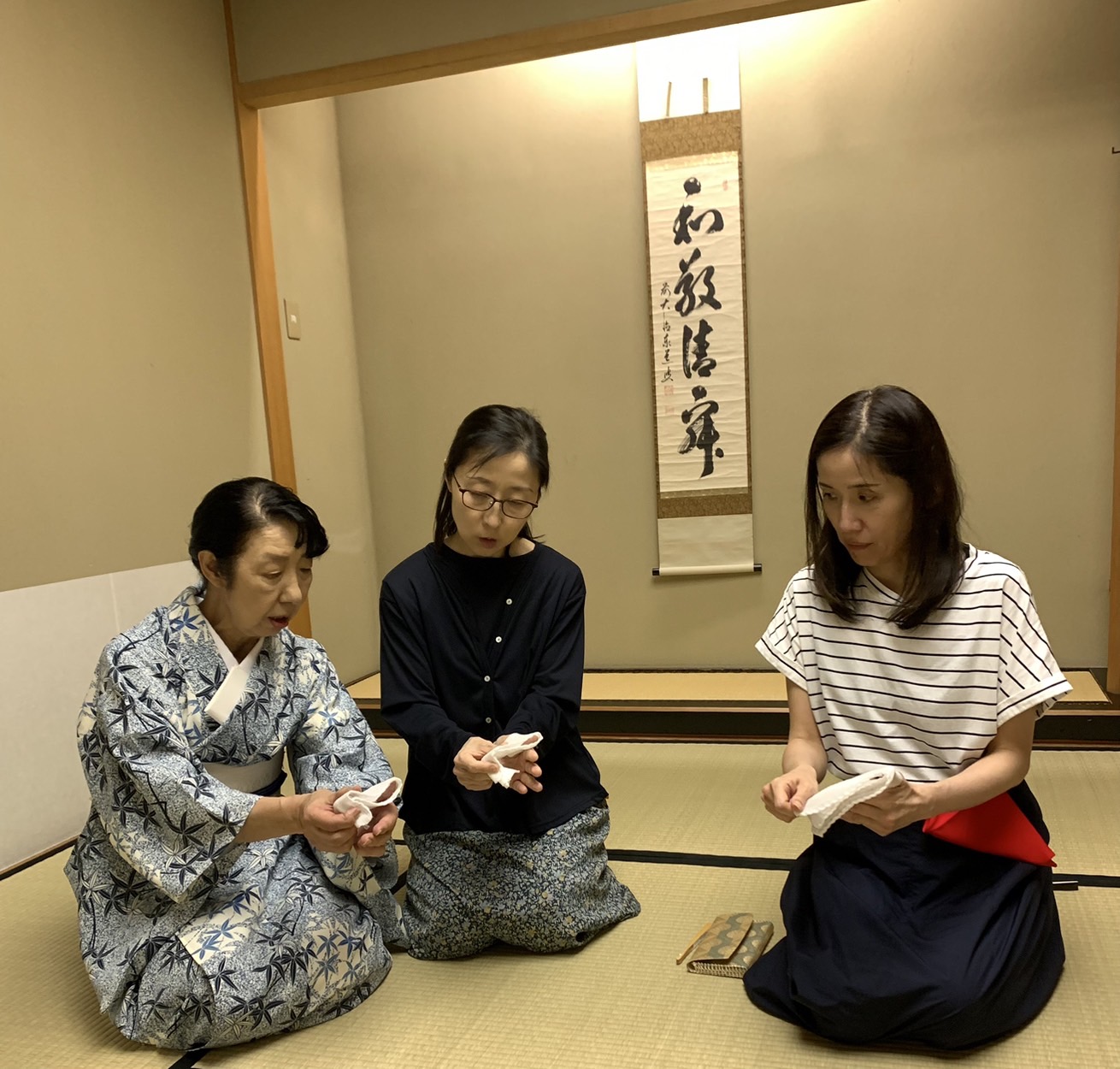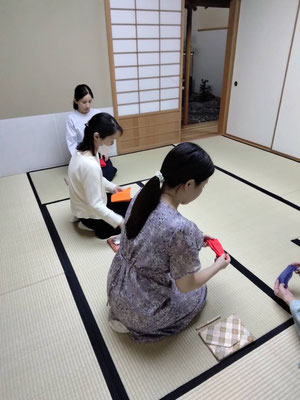 受講生の割り稽古は帛紗さばきから茶巾のたたみ方に進みました。講師の手の動きを見ながら一生懸命に取り組みます。ひとつひとつの所作はもとより、設えや道具の扱いなど、スタッフも一緒にお茶の心を学んでいきたいと思いました。