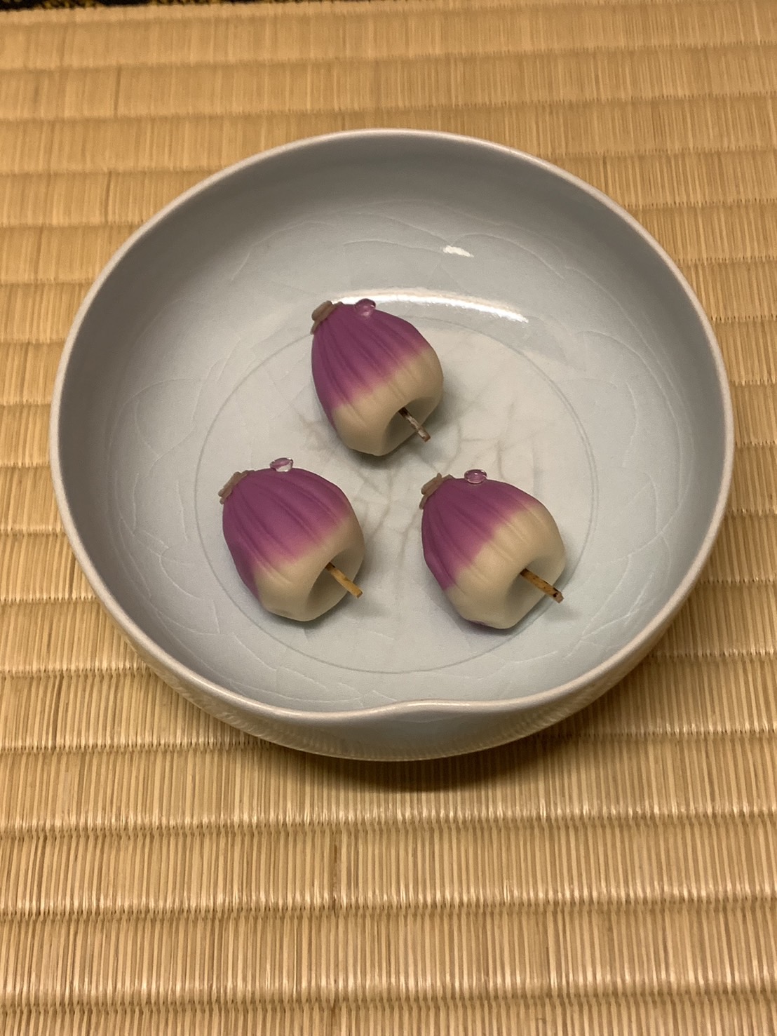 巳年やお勅題「夢」に因んだお道具の話を聞きながら、お正月らしい花びら餅のお菓子に一同笑みがこぼれました。
