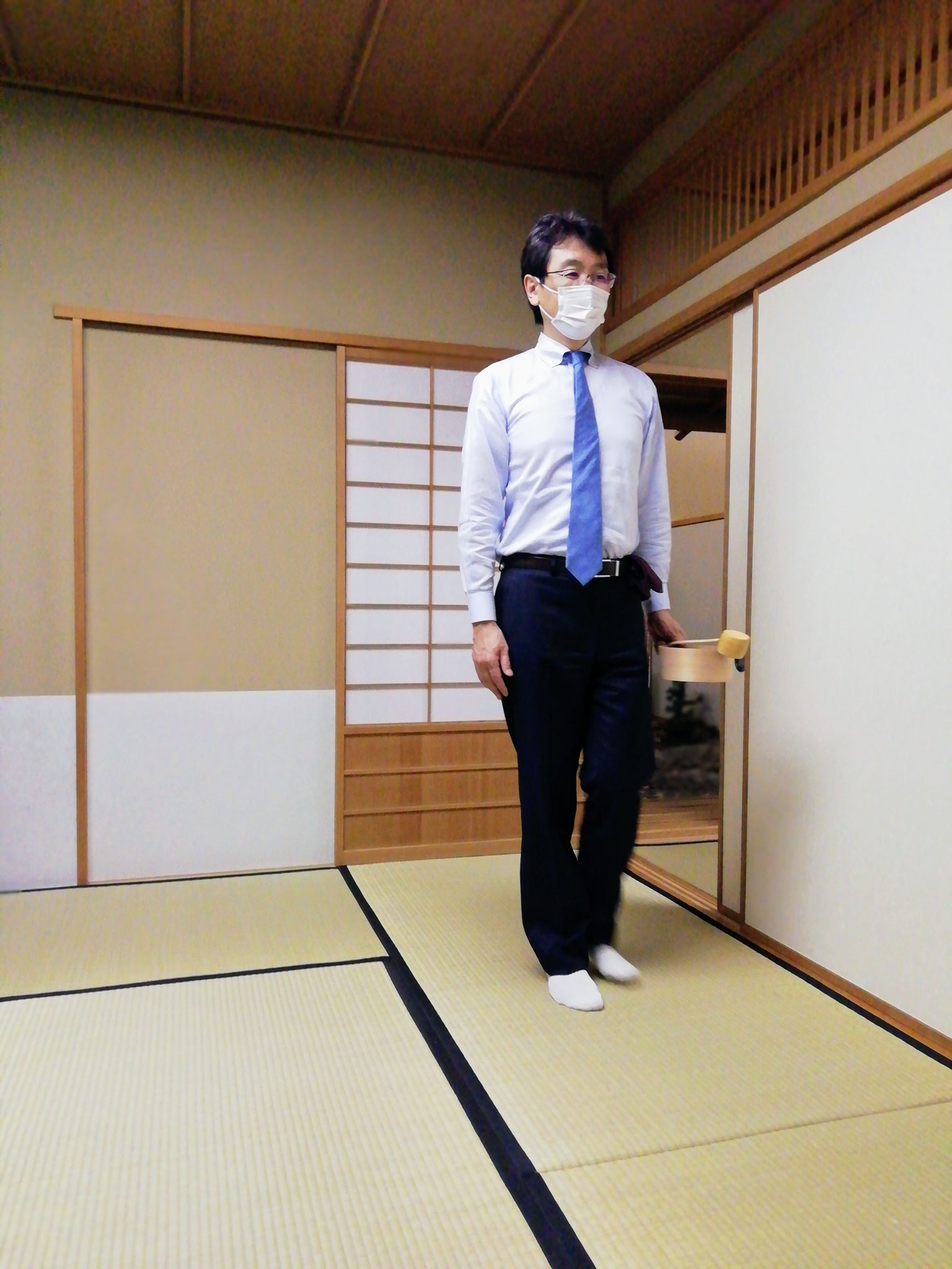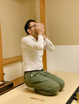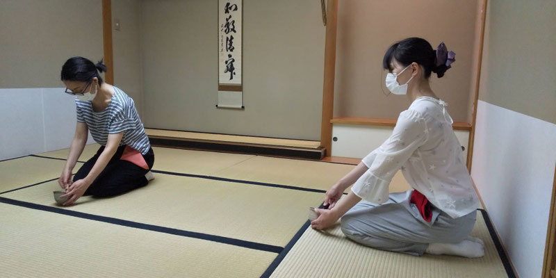 体験で参加された方は、襖の開け方、歩き方、床の間の拝見の仕方、袱紗のたたみ方を学ばれました。「えっ、歩き方ですか?」と驚かれていましたが、すぐに自然に歩いていらっしゃいました。茶筅でお茶をたてるのは初めてとのこと、お自服してほっとされたご様子でした。