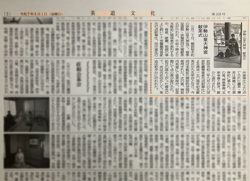 令和7年8月1日の、新聞「茶道文化」に、伊勢山皇大神宮献茶式の記事が掲載されました。
